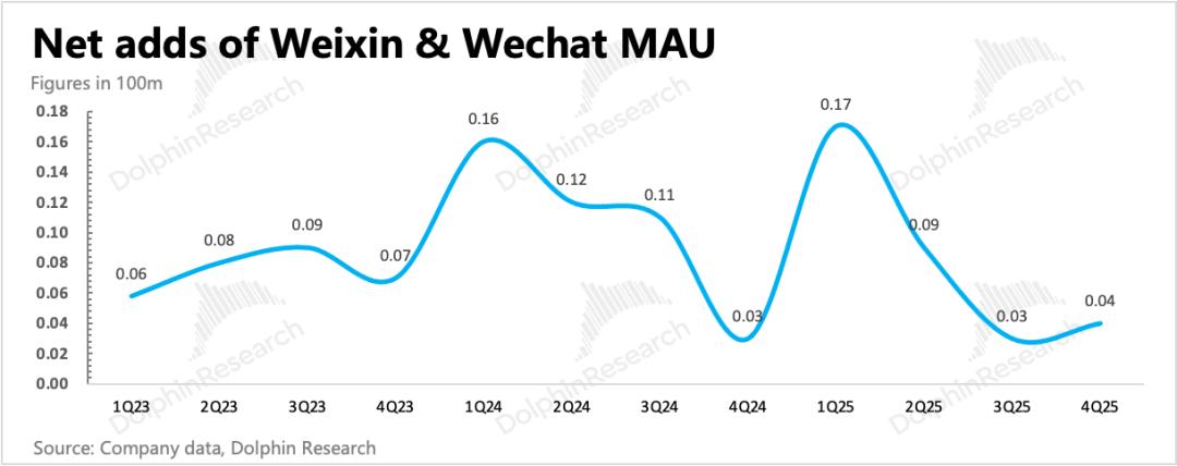 四季度微信用户14.18亿,环比净增400万,稳定扩张但节奏放缓。QQ没啥好说的,继续下滑。