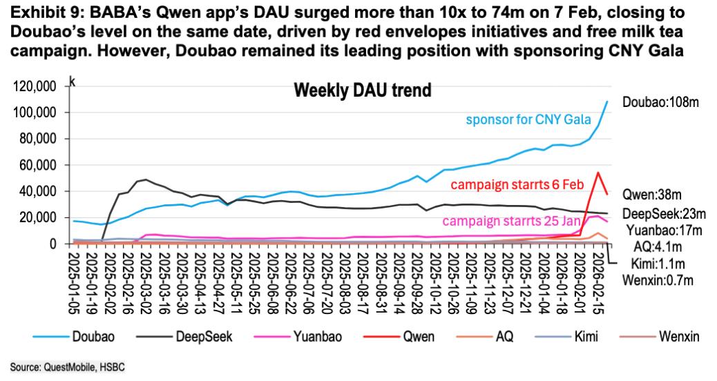 AI chatbot上,元宝app下载量在今年年初的营销活动下有明显反弹,但千问来势汹汹,配合外卖红包等场景服务,经过春节之后目前用户规模已经高于元宝。豆包则仍是翘楚,春晚的赞助又拉了一大波流量。