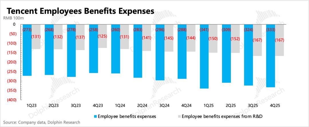 四季度单看推广费用同比增长44%,环比多花了15亿。除了少量新游戏宣发外,应该就是主要用于元宝买量了,显然Q1销售费用只会更高。其他支出增长较多的,主要还是和AI相关的服务器费用以及研发人员成本。
