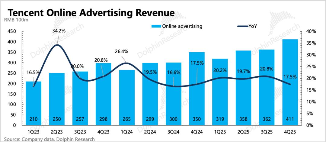 四季度消费环境依旧不佳,腾讯广告则继续保持近18%的增速,略微不及BBG一致预期,不过年初以来部分机构考虑到消费寡淡,已经小幅下调了广告预期。