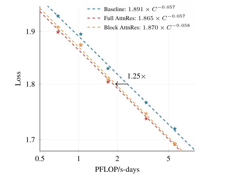 规模化法则曲线显示:在同等算力投入下,应用Block AttnRes的模型始终获得更低的损失值。简单换算,该架构使模型能达到传统基线模型需耗费1.25倍算力方可实现的性能。对于耗资动辄千万美元级的预训练阶段而言,“白嫖”25%的算力增益,蕴含着巨大的商业价值。