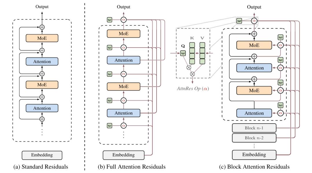 这正是Kimi论文的核心创新——注意力残差(Attention Residuals, AttnRes)。传统残差累加公式被重塑为一个基于Softmax的注意力加权形式: