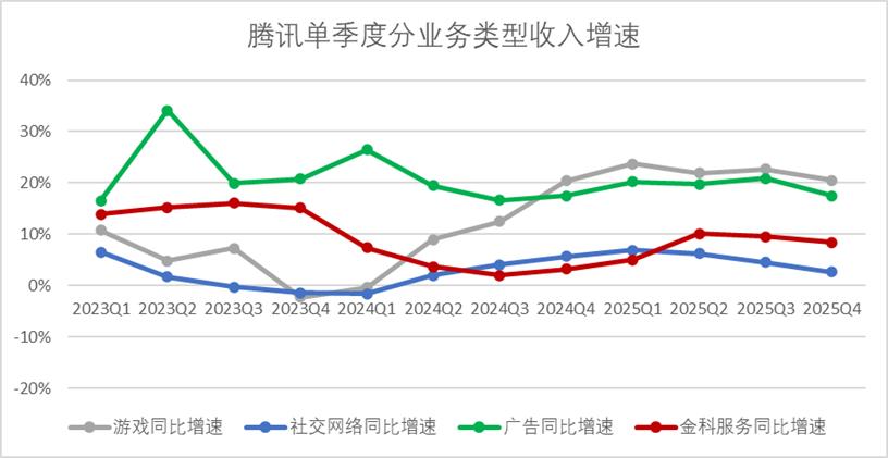 增值服务业务板块的另外一面,就是涵盖视频号和内容平台会员的社交网络业务,2025年四季度腾讯社交网络业务收入306亿元,同比增速仅有2.7%,连续三个季度增速下滑,显然这与年初市场对今年视频号商业化提速的预期不符。