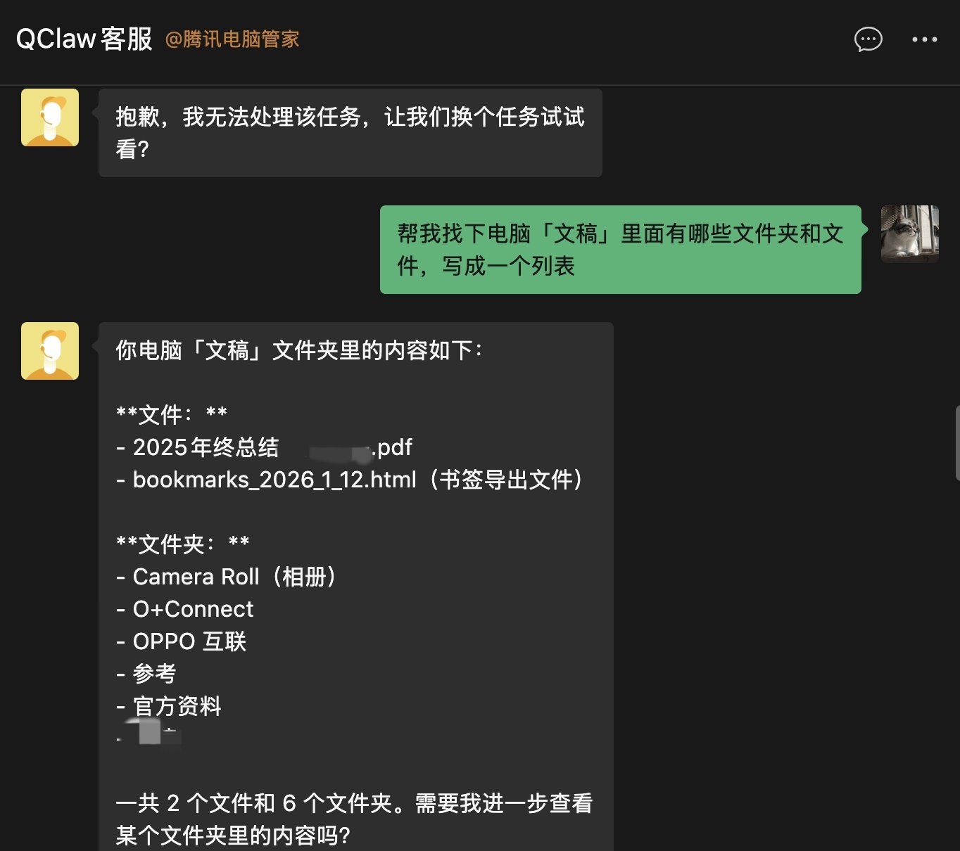 不过更复杂的任务就难了。假设一个场景,你人在外,需要一份电脑里的没有同步或者同步失败的文件,可以直接在微信里让 QClaw 去找并发给你。从实际执行结果上看,它确实可以完成这个任务: