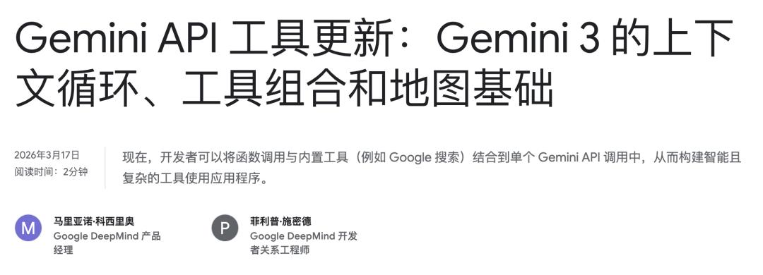 谷歌DeepMind刚刚为Gemini API放了一个大招:内置工具和自定义函数终于可以在同一次调用里混着用了。再加上跨工具的「上下文环流」和Google Maps原生接入,Agent开发的编排噩梦正在终结。如果你做过AI Agent开发,一定经历过这种痛苦——模型要先调Google搜索拿外部数据,再调你的后端API查库存,中间还得你自己手动把上一步的结果喂给下一步。整个流程像在拼乐高,但每块乐高的接口都不一样。
