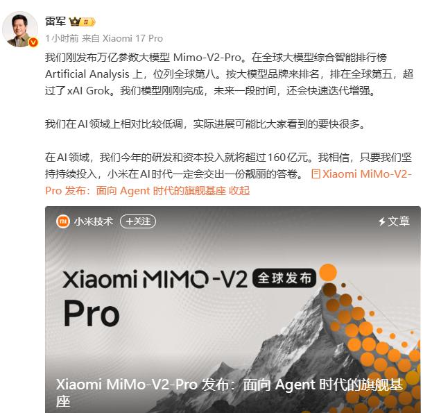 随后,小米创始人雷军在微博表示,小米刚发布万亿参数大模型Mimo-V2-Pro,并披露小米在AI领域"实际进展可能比大家看到的要快很多",今年AI研发与资本投入将超过160亿。