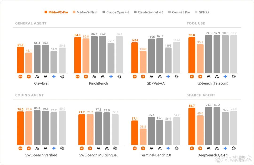 值得一提的是,MiMo-V2-Pro 专为 Agent 场景深度优化。MiMo-V2-Pro 针对复杂多样的 Agent Scaffold 进行 SFT & RL,具备更强的工具调用与多步推理能力。在 OpenClaw 标准评测榜单 PinchBench、ClawEval 上,MiMo-V2-Pro 效果处于全球顶尖。同时,凭借 1M 的超长上下文窗口,MiMo-V2-Pro 能够从容支撑高强度的真实 Claw 复杂应用流。