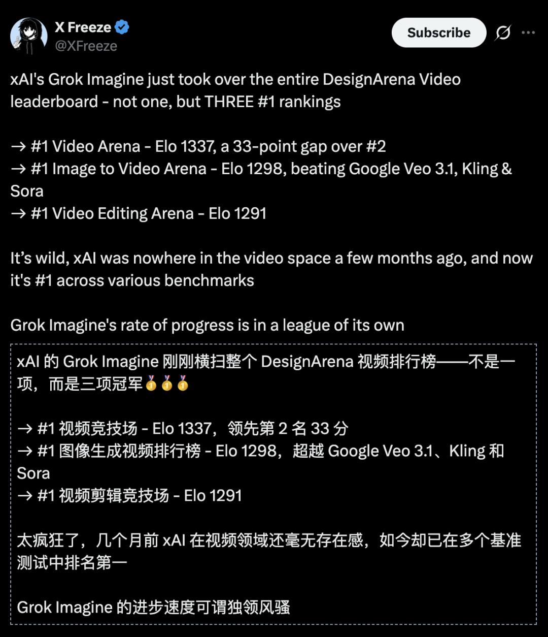 Grok Imagine在这里一鸣惊人,拿下三个类别的第一: