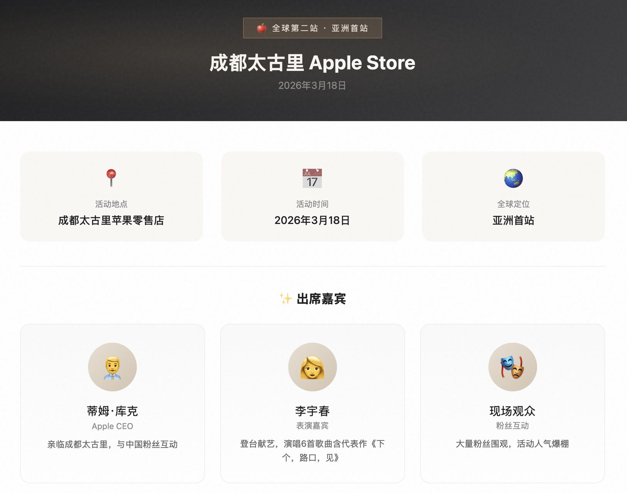 AI智能体基于即时信息获取、第一时间产出的「库克成都行」庆典活动梗概页面(来源:雷科技,节选)