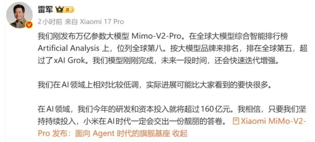 MiMo-V2官宣后,雷军迅速发文为其站台: