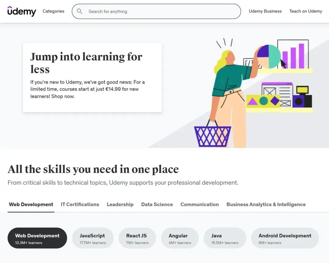 Udemy是一个在线学习和教学市场,有 250000 余门课程,拥有 7300 万 名学员。课程包括编程、市场营销、数据科学等等是专业远程学习领域的巨头,它为寻求提高技能的人们提供在线学习课程。