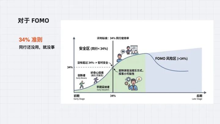 而对于 FOMO 的问题,对于很多朋友担心的会不会被龙虾替代的问题,有个评判标准:对于新技术,如果你身边同行使用的比例还没有超过 34%,那你不用,暂时都是安全的。