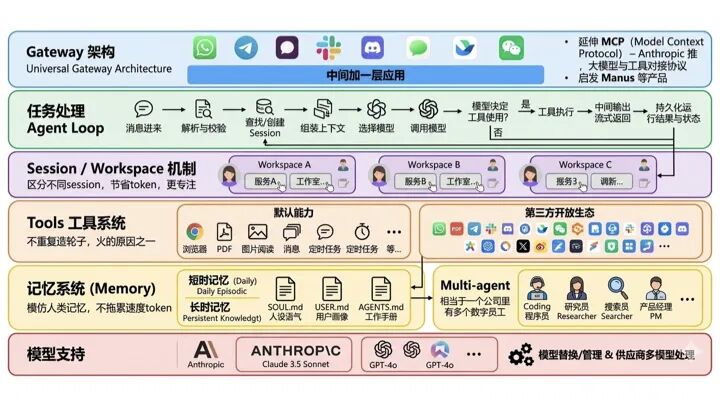 第一层是 Gateway 架构。有一个可以随时访问的网关,各种聊天工具都可以通过它来调用,不管是在服务器上还是本地搭的,联网就能访问。