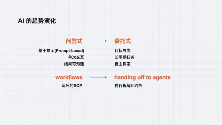 以前是一对一在聊天机器人里问,现在是告诉它一个任务,它自己去拆解。以前要下具体的目标,现在越来越模糊也能处理。Manus 也是这个方向。