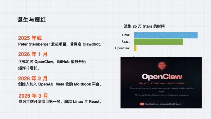 36氪 3 月 3 日的报道写到,OpenClaw 开年后「一天斩获 9000 颗星,两周突破 17 万星」。现在已经是全站开源项目的第一名,超过了 Linux 和 React。对比很鲜明——React 花了 13 年到 24 万星,OpenClaw 花了 60 天到 25 万。
