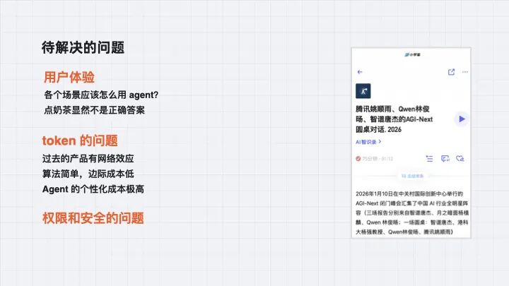 这跟过去的互联网算法不一样——互联网产品有网络效应,越做越顺,边际成本越低。但 token 不是这样,它需要上下文越长才能越懂你,没有那么简单。