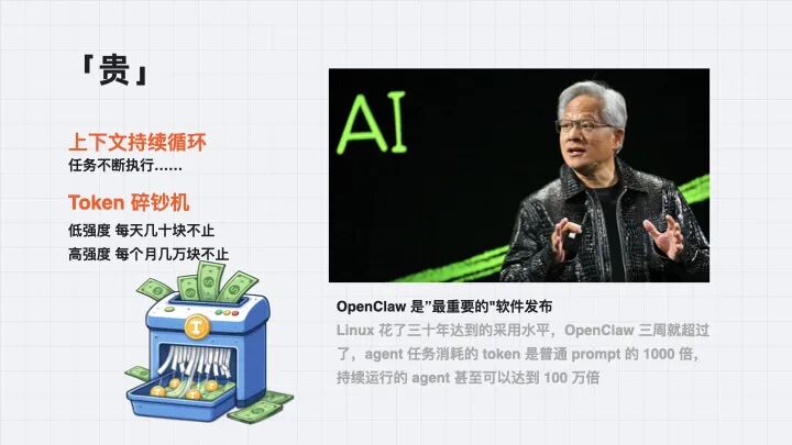 黄仁勋非常高兴。他当然非常高兴。3 月 5 日在摩根士丹利会议上,他说 OpenClaw 是「最重要的」软件发布。「Linux 花了三十年达到的采用水平,OpenClaw 三周就超过了,agent 任务消耗的 token 是普通 prompt 的 1000 倍,持续运行的 agent 甚至可以达到 100 万倍。」可不高兴吗。