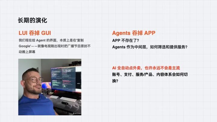 从施乐的图形界面到苹果影响的一代交互,这些我们认为天经地义的产品设计上的东西,都要发生巨大变化。目前,语言真的能理解得很好,指挥工作,agents 会越来越实在。