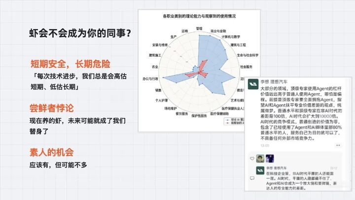 有一个尝鲜者悖论:现在最早用得爽的人,是未来最可能被替代的人。你现在用它解决很多问题解决得很好,这些任务未来都会被 AI 解决掉。你现在养的虾,别人养的虾,未来可能就成了你的替身。