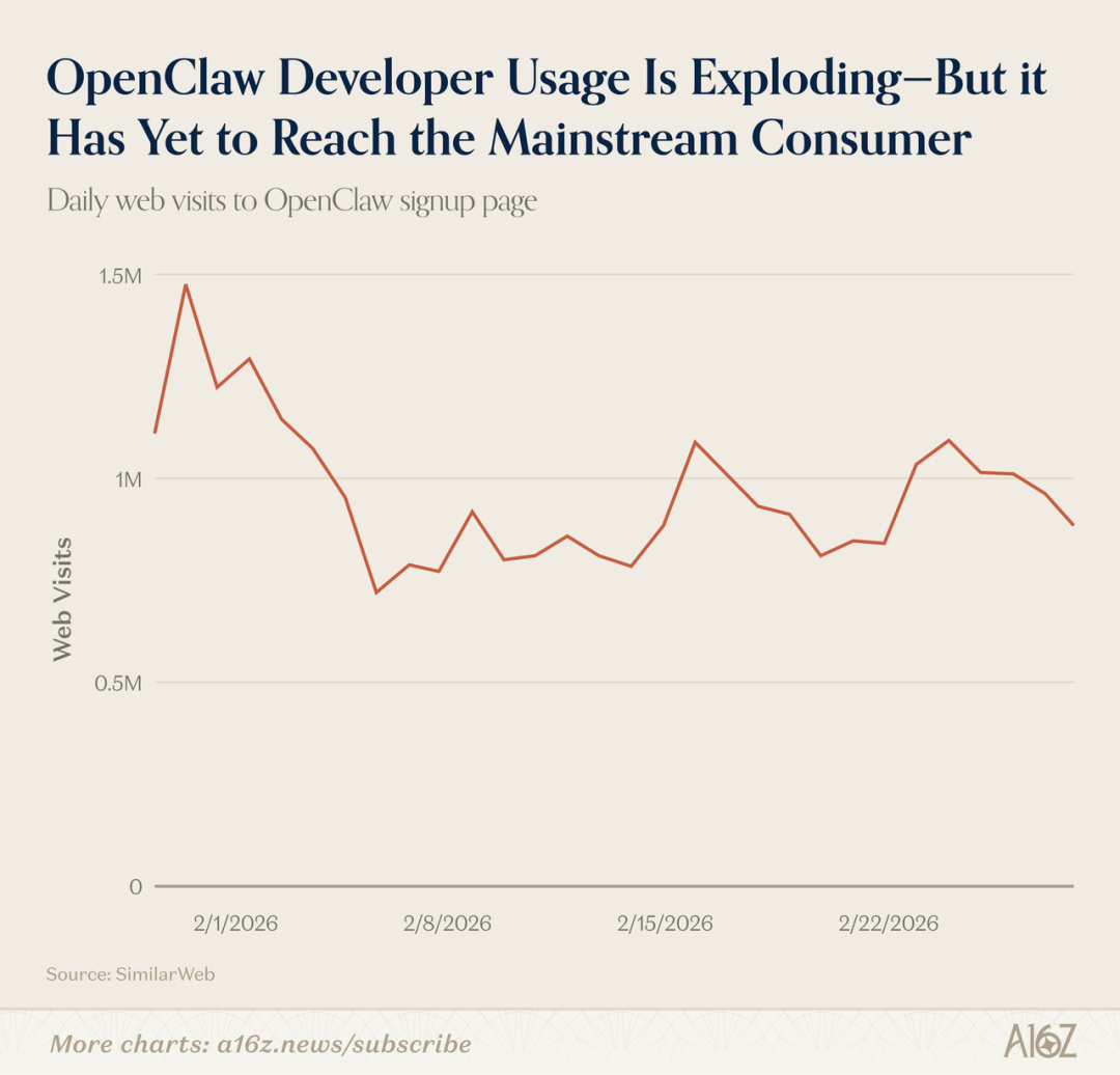 关于Open Claw,真正有趣的一点是,它在技术社区的使用量一直在持续加速。现在,我想它是有史以来GitHub星标数第一的项目,它超过了React,Linux。但就总体新用户而言,它已经趋于平稳。我们查看了"开始使用"或注册页面的访问量,自二月初以来每周都持平。这表明,如果你懂技术,它是一个很棒的产品,但它尚未完全破圈,触及非技术人员——这当然是一个庞大得多的人群。他们后来被OpenAI收购了。所以如果我猜,或者我希望看到OpenAI做的是,建立产品联系,将Open Claw整合到主流消费者可以使用的产品中。而且,Open Claw架构背后的理念也启发了许多其他创始人。比如我们一天要听多少 pitch,创始人会说:“我想成为这个领域的Open Claw”,或者“Open Claw让我意识到这是可能的”。所以Open Claw本身会继续成功,成为一个巨大的产品。我猜我们会看到更多针对不同用例的、垂直化聚焦的Open Claw版本。