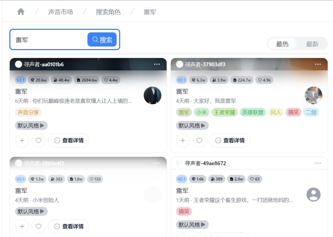例如近期DAU飙升的AI语音平台“Reecho睿声”,该平台的“声音市场”,一些用户上传了多段雷军语音的音频示例,在此基础上,其余用户输入任意语句,即可制作对应的“雷军”AI配音。