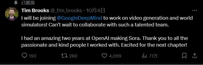 无独有偶,10月4日,Sora团队负责人之一Tim Brooks也表示自己已离开OpenAI,将加入OpenAI的竞争对手谷歌DeepMind。