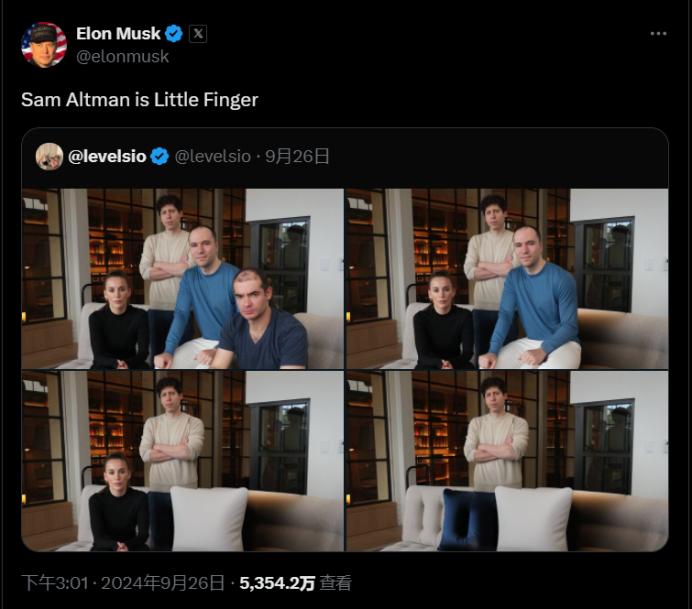 对此,马斯克紧跟着在X平台上发文嘲讽“Sam Altman is Little Finger”,并转发了与阿尔特曼合照的其他三位高管逐渐被抹去的帖子。
