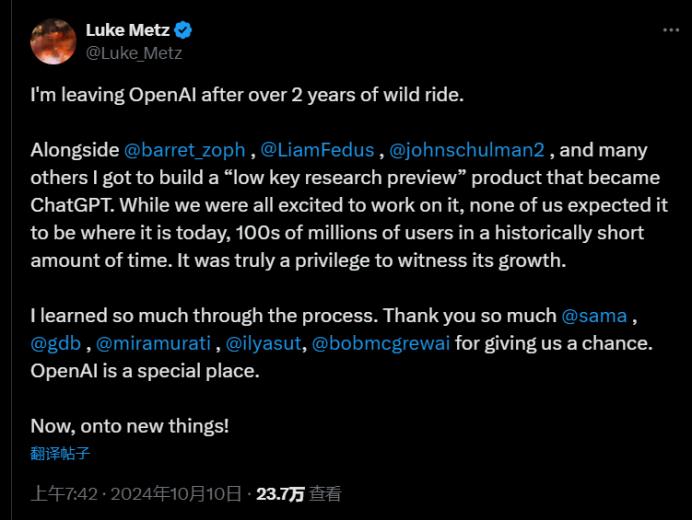 10月10日,o1推理模型贡献者之一Luke Metz,发文称自己即将离开OpenAI。