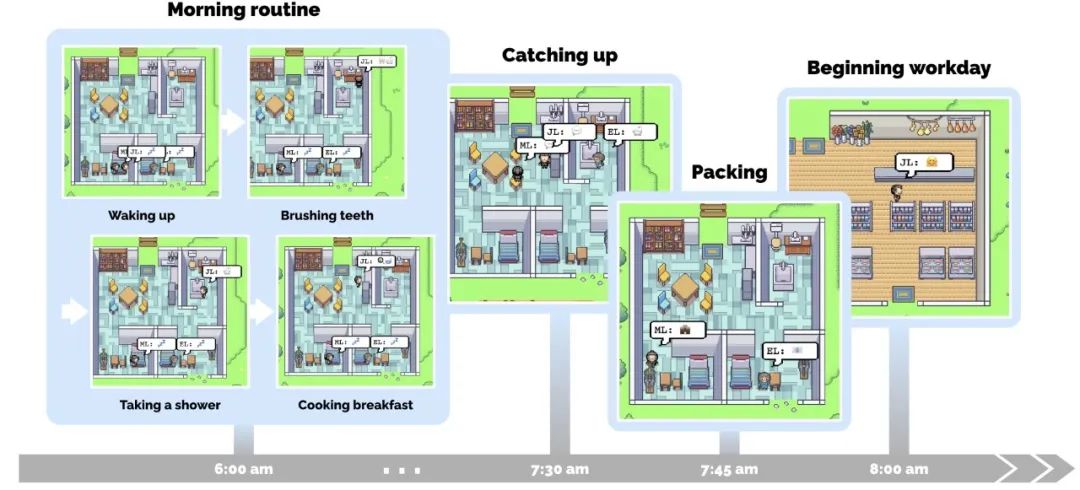 除了对Agent处理复杂任务能力的探索,2023年斯坦福大学的人机交互研究小组还创造了一个包含25个Agent的AI小镇,用以模拟社会互动。这个AI小镇设有大学、公寓、咖啡馆和书店等基础设施,Agent在其中居住并进行日常活动,尽管他们没有意识到自己生活在模拟环境中。这些Agent不仅能去工作、闲聊、组织社交活动、结交新朋友,甚至能坠入爱河,每个Agent都有独特的个性和背景故事。通过这种社会化模拟,展示了Agent在复杂的人类社交环境中的适应能力和行为多样性。