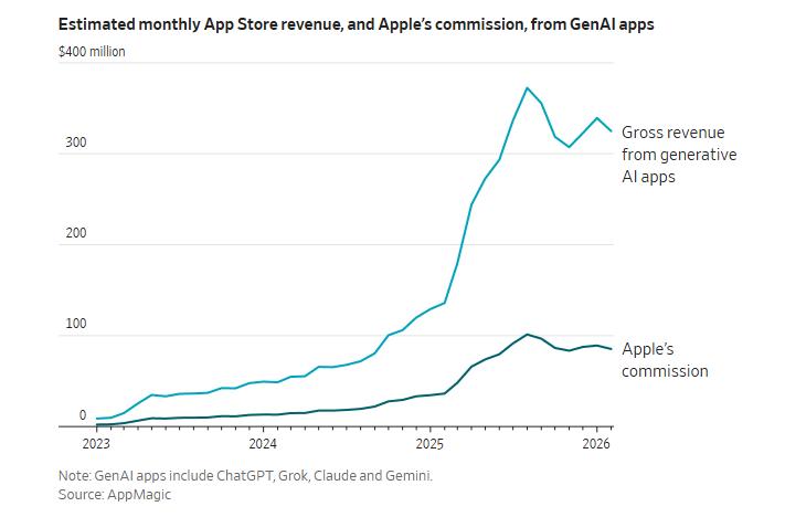 2025年,亚马逊、Alphabet、Meta、微软四家公司在AI基础设施上砸下近7000亿美元,摩根士丹利预测亚马逊的自由现金流将因此转负。同一年,苹果几乎没有在大模型上花什么钱,却从生成式AI应用中收取了近9亿美元佣金。根据分析公司AppMagic的数据,今年这个数字预计突破10亿美元。
