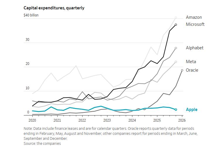 重金投入已开始挤压财务空间:摩根士丹利预测亚马逊今年自由现金流将转负,美国银行给出的缺口估算高达280亿美元。巴克莱银行则认为Meta的自由现金流可能锐减近90%。相比之下,苹果的资本支出仅为竞争对手的零头。