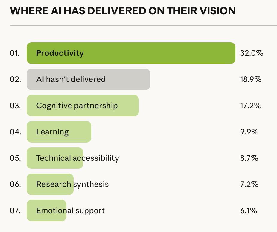 表面数据显示,18.8%的人希望「职业卓越」——让AI处理杂活,自己做更有价值的工作。