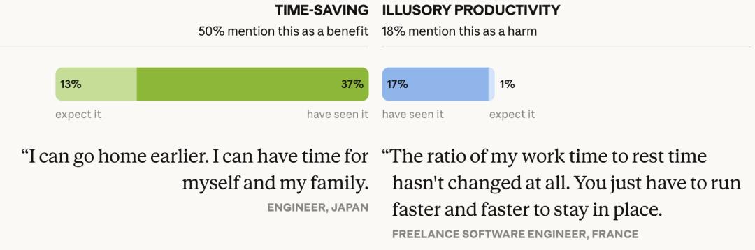 50%的人说AI帮他们省了时间——这是被提及最多的好处。但19%的人说自己实际上更忙了。一个自由职业工程师说:「工作和休息的比例一点没变。你只是得跑得更快,才能留在原地。」自雇者既拿到收益也承受压迫,没有机构可以缓冲。