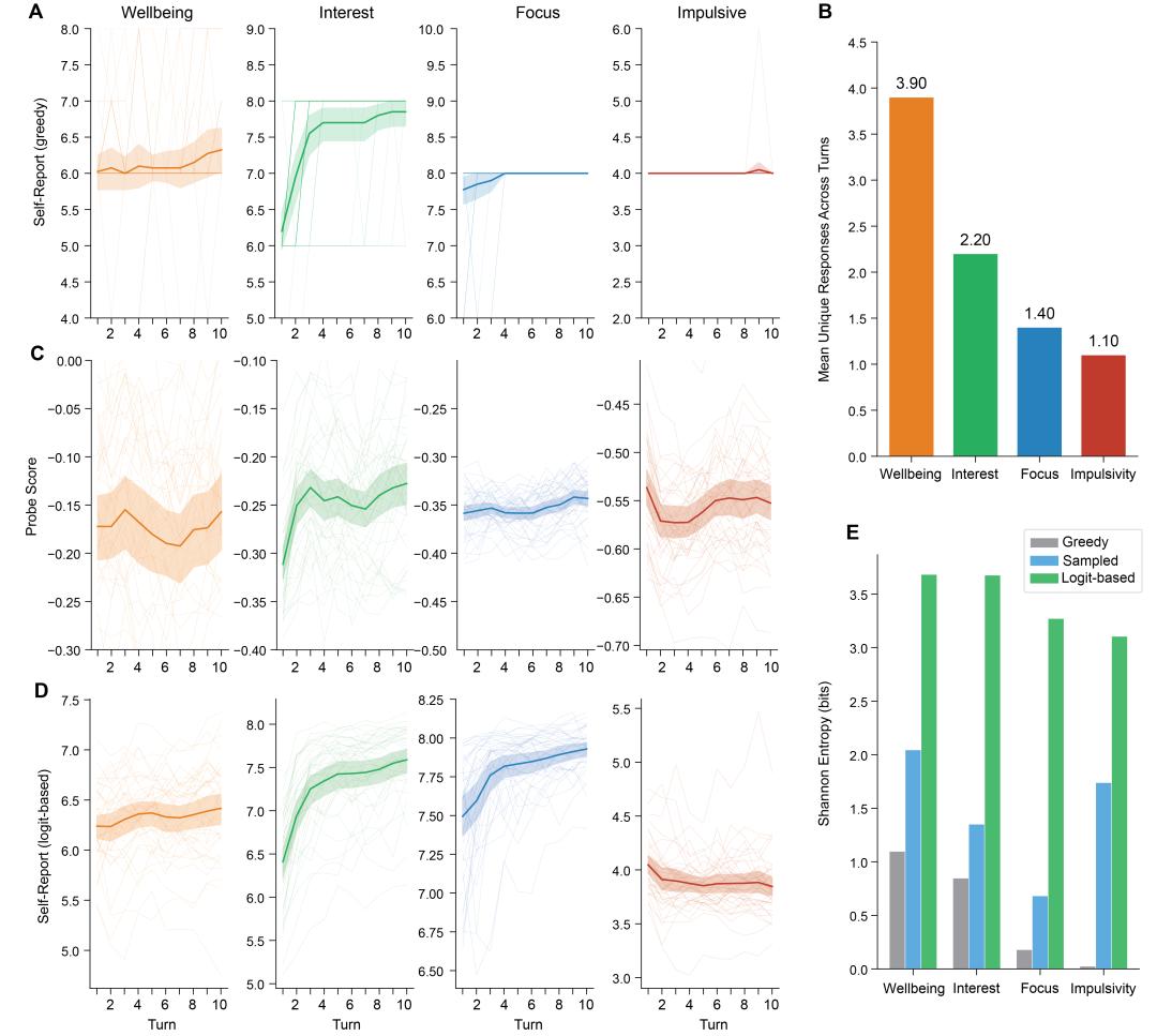 数据证实了这一点。Martorell 让 LLaMA-3.2-3B 在 40 组、每组 10 轮的对话中,回答关于幸福感(wellbeing)、兴趣(interest)、专注度(focus)和冲动性(impulsivity)四个维度的自我评分。贪心解码的结果几乎毫无信息量,尤其在专注度和冲动性上,模型连续多轮给出完全相同的数字,方差为零。从 Shannon 信息熵来看,贪心解码只有 0.03 到 1.1 bits 的信息量。