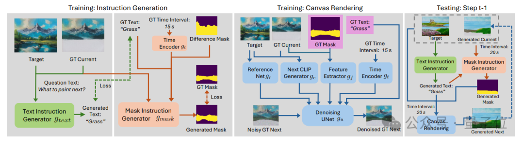 前者通过比较目标画作和当前画布的状态,生成一个简短的文本指令,比如“画天空”或“加花朵”,以此决定下一步应该添加哪些元素。