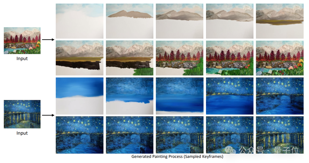 学习艺术家的绘画过程。收集了 294 个丙烯酸风景画绘画过程视频(平均时长 9 分钟),并进行视频帧分割、裁剪和筛选等预处理操作,让模型学习绘画过程;
