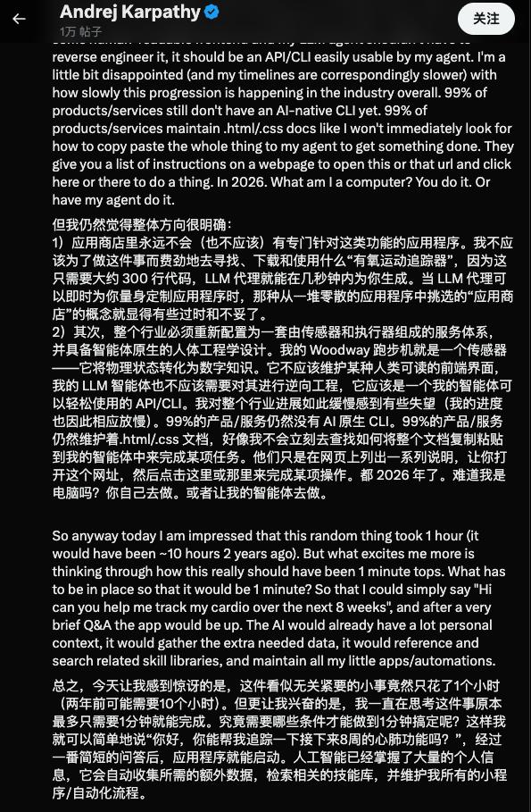 这套叙事的代表言论很多。Karpathy 说过,OpenClaw 的创始人 Peter Steinberger 在 Lex Friedman 的播客上说过。社交媒体平台上到处是「AI agents will replace 80% of apps」的标题。投资人和创业者们把「无界面」当成 AI 时代的默认终局。