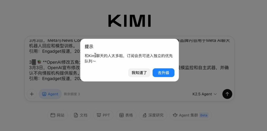 但当我切到它的智能体(Agent)页面,明明后台白纸黑字显示着“还有 3 次可用额度”,点击运行后,依然弹出了那句冷冰冰的提示:“和 Kimi 聊天的人太多啦,订阅会员可进入独立的优先队列~”最后,直接甩出一个引导充值会员的按钮。