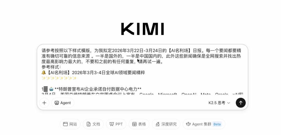 我打开了Kimi,让它帮忙汇总一份2026年3月22至24日的最新的 AI 行业日报,并给到了一些指令和参考的样式。
