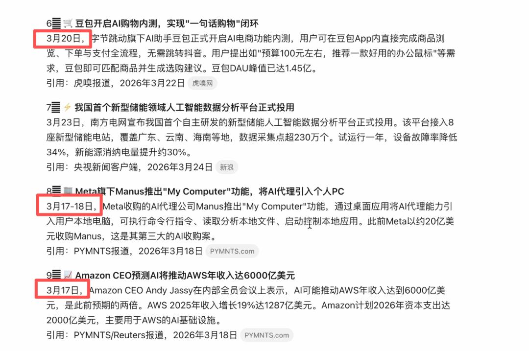 结果呢?它给出的答复虽然勉强能看,但仔细一盘逻辑和时间线,里面堂而皇之地塞进去了好几条 3 月 20 号以前的旧闻。