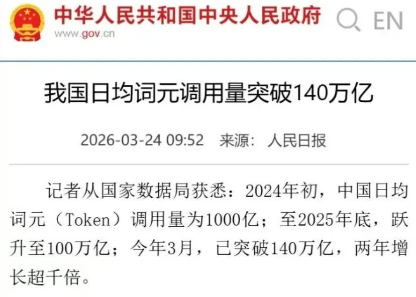 截至 2026 年 3 月,我国日均词元调用量突破140 万亿次.
