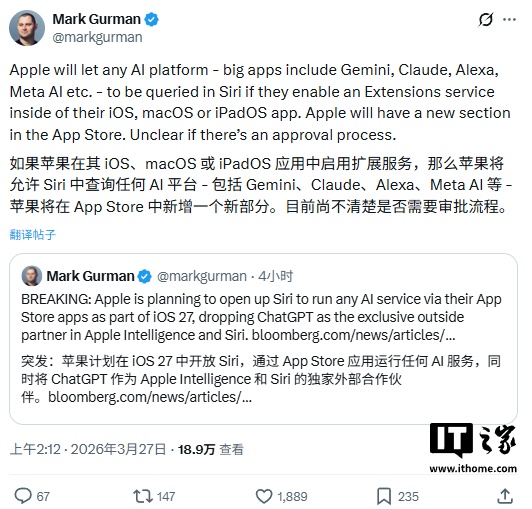 IT之家 3 月 27 日消息,据彭博社马克 · 古尔曼报道,苹果计划从 iOS 27 开始允许第三方 AI 聊天机器人与 Siri 进行集成。