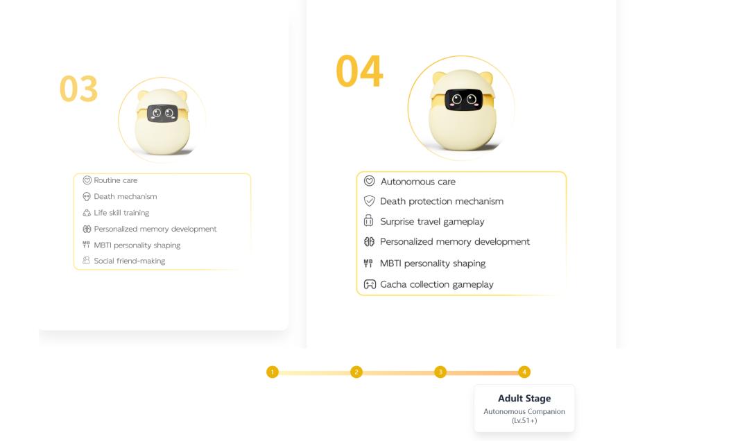 但这些都不是重点,重点在于它拥有长期记忆能力,能记住大约三百条和用户之间的日常互动回忆,用户需要通过不断地交互、照顾Sweekar,让它度过孵化期、婴儿期、青少年期和成年期四个阶段,才能完成全部功能的解锁。