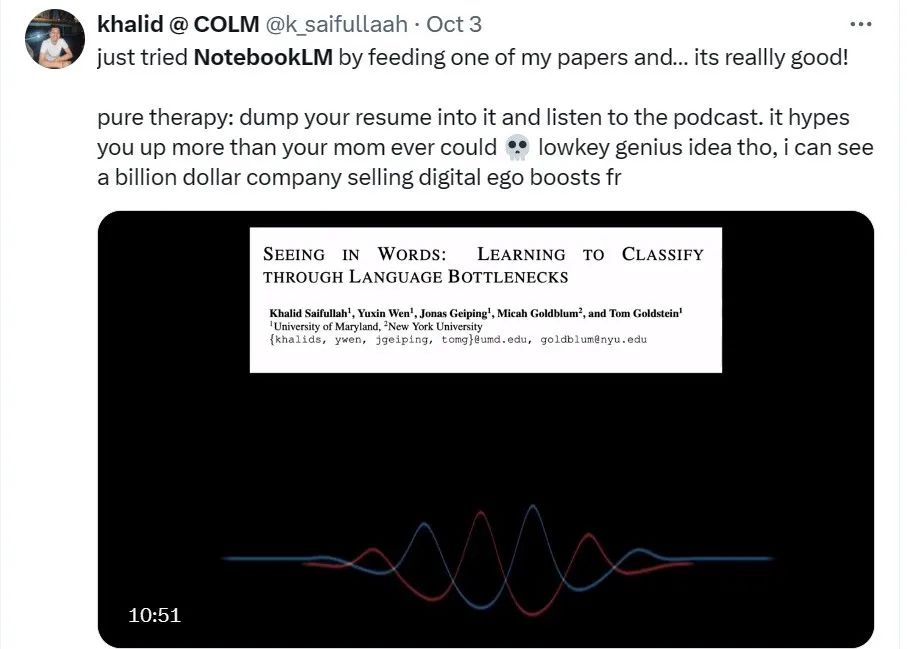 “如果你感到有点沮丧,把你的社交动态粘贴到NotebookLM中,就能得到一通8分钟的‘真人’深度赞美。”