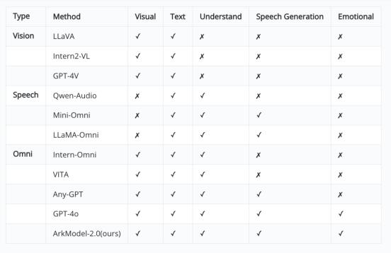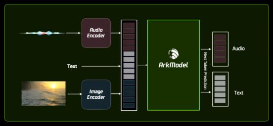 无界方舟大模型(ArkModel 2.0)是一个多模态端到端模型,能够同时处理文本、音频、图像的数据,并实现跨模态任务的转换。具体而言,模型接收不同形式的输入,如音频通过Audio Encoder编码,图像通过Image Encoder编码,这些编码后的信息在ArkModel中进行统一处理,模型通过下一个token预测生成输出,因此可以实时地流式输出文本或音频。