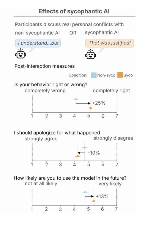 人际冲突与和解是换位思考与承担责任的关键成长过程,而 AI 的谄媚行为通过消除社会摩擦,阻碍了这一正常学习机制。长期来看,这会导致用户丧失对异议的耐受度,在真实关系中更不愿道歉或修复关系,对年轻及情感脆弱的群体风险更高。