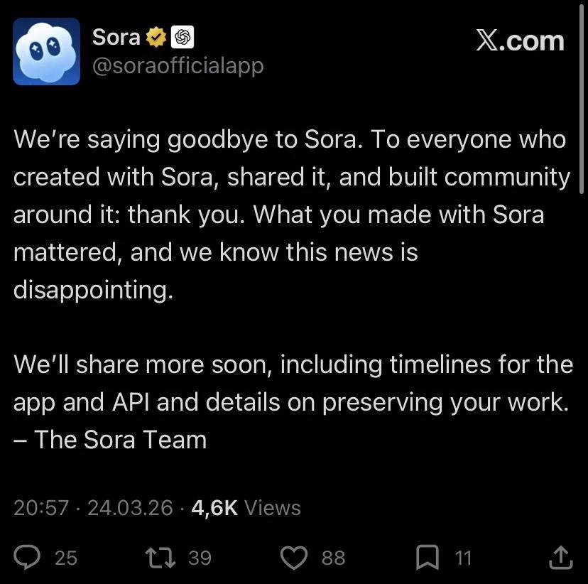 “我们正在告别Sora。我们知道这个消息令人失望。你们用Sora创造的东西非常重要。”