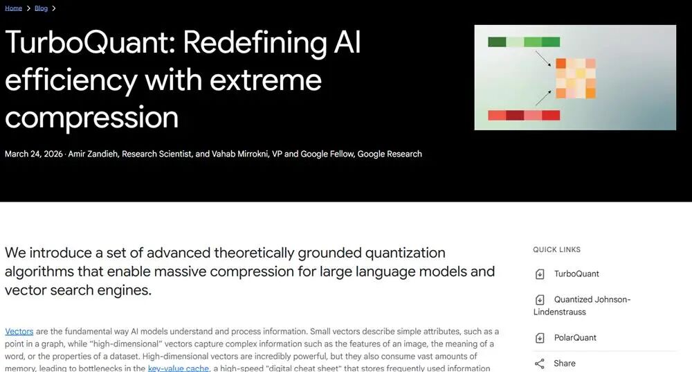 智东西3月29日报道,近日,谷歌的TurboQuant论文引发全网广泛关注。该论文提出的TurboQuant技术,据说能将大模型KV缓存的内存占用压缩至原来的1/6,似乎给当下的“AI存储荒”提供了解决思路,因此一度引发美股多支存储股大跌,市值合计蒸发超过900亿美元(约合人民币6220亿元)。