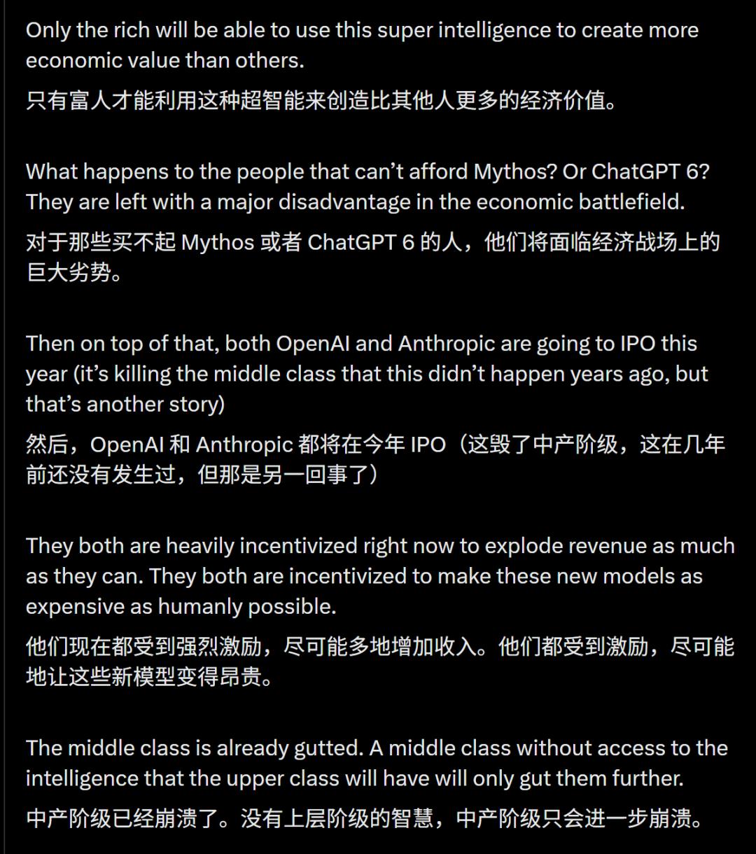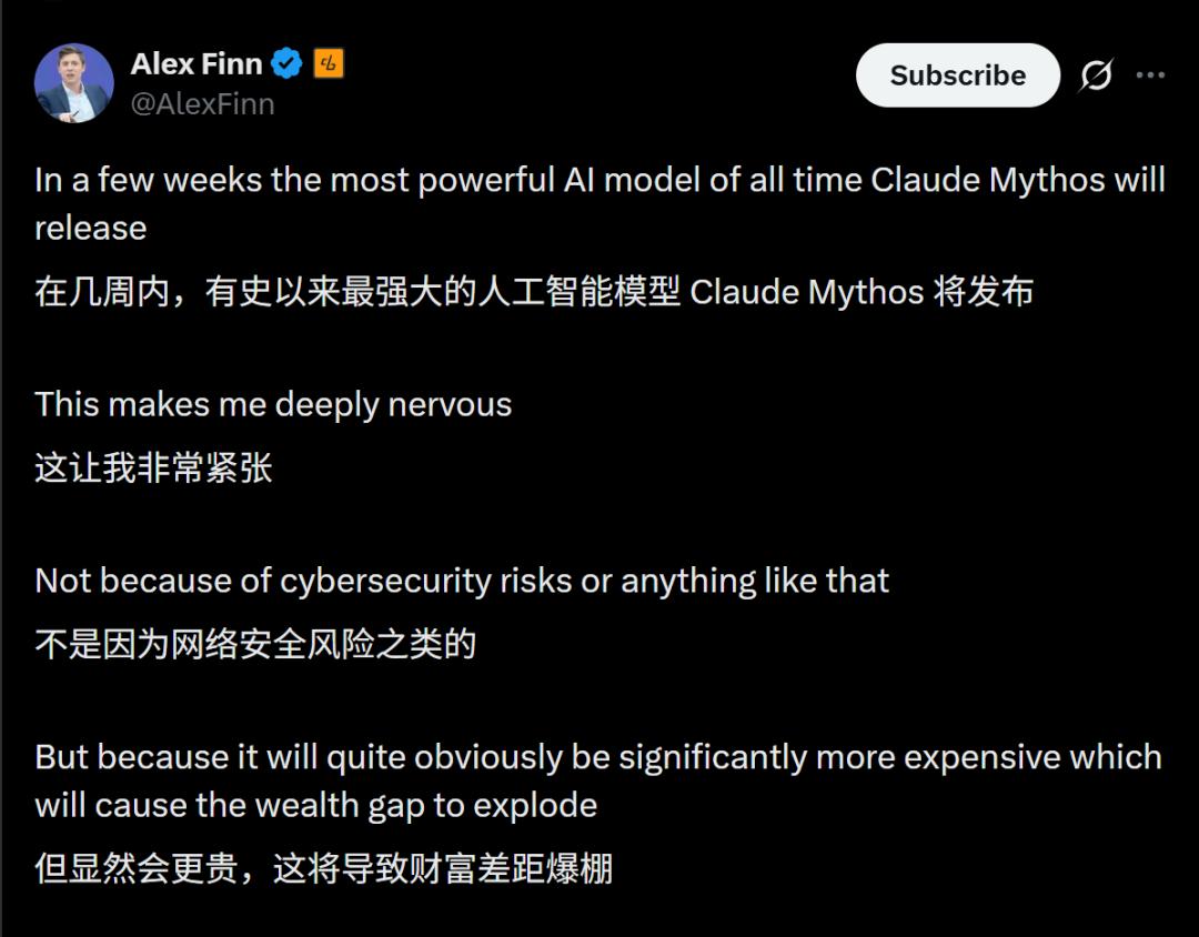Creator Buddy的创始人Alex Finn也发表了一条X,表示Mythos的发布让自己极其紧张,因为这将导致财富差距爆棚!