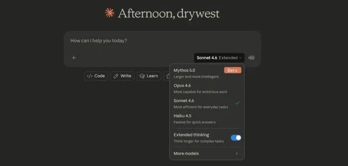 Claude交互界面中,Mythos 5.0(Beta)赫然在列,官方将其称之为「规模更大、更智能」。